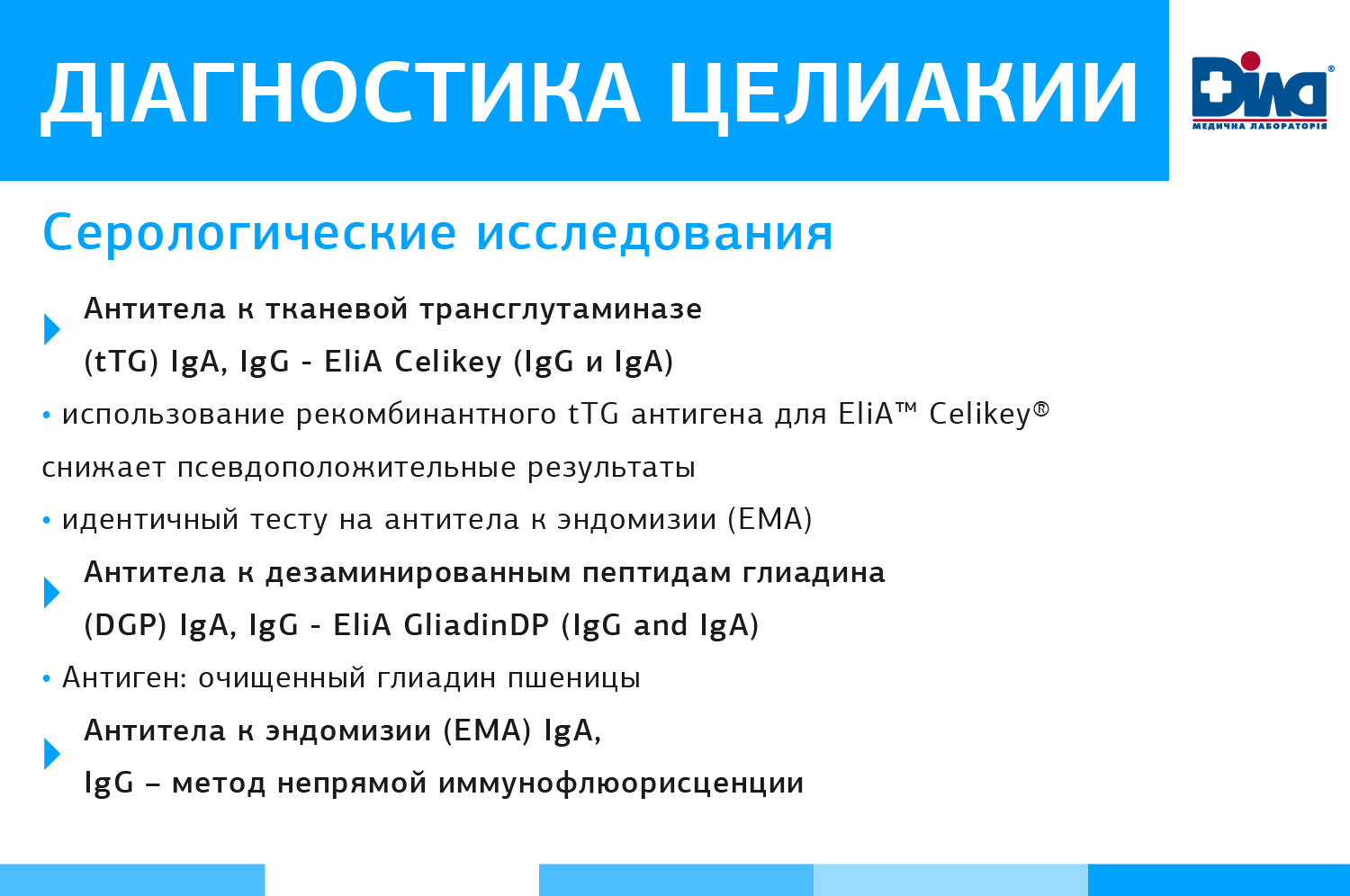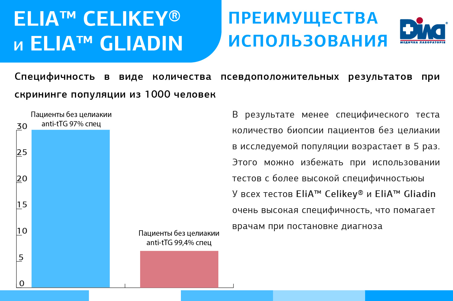 Алгоритм серологической диагностики ГЛС от ДІЛА базируется на тестах ВТОРОГО ПОКОЛЕНИЯ, что соответствует мировым и Европейским тенденциям диагностики. Основные преимущества диагностики Целиакии – специфичность и чувствительность тестов EliA™ Celikey® и EliA™ Gliadin. (См. ниже)