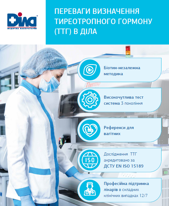 Точность определения ТТГ имеет принципиальное значение в правильной оценке дисфункции щитовидной железы. В ДІЛА тиреотропный гормон (ТТГ) определяют биотиннезависимым методом, методикой третьего поколения, исключающей влияние факторов интерференции на результат.