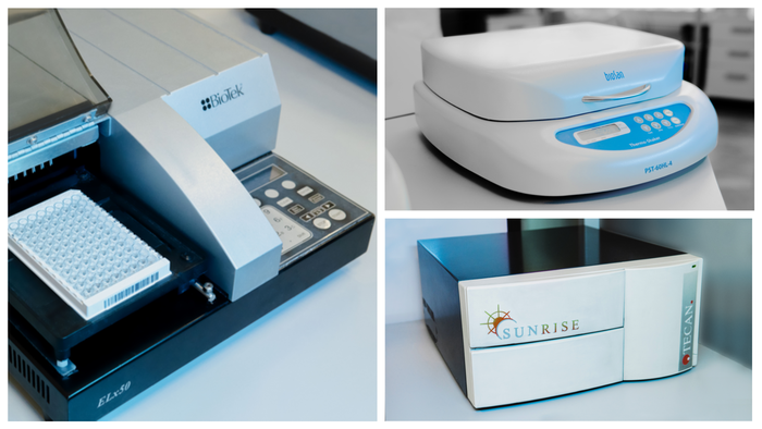 Фотометрический ридер SUNRISE (Tecan, Austria), автоматический вошер Elx50 (BioTeck, USA), инкубаторы-шейкеры Комплект оборудования для проведения твердофазного иммуноферментного анализа (ИФА) используется для исследований гормонального статуса, аутоиммунных патологий, онкомаркеров и инфекций. |