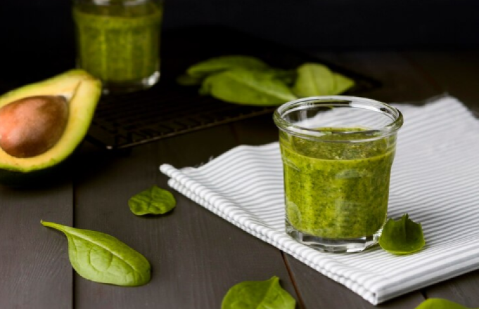 2. Смузи из авокадо: взбейте авокадо с бананом, шпинатом, миндальным молоком и медом.