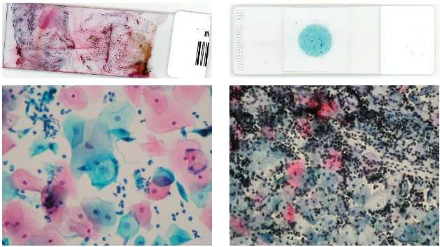 и приготовление, в т.ч. и автоматическая окраска препарата (справа) на BD PrepStain TM Slide Processor.