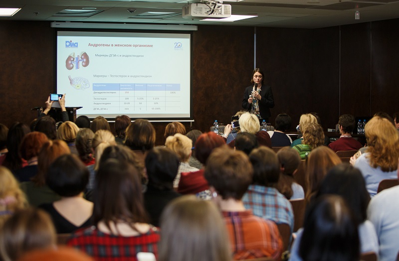 Первый доклад «Взгляд эндокринолога на инсулинорезистентность» был посвящен целому ряду заболеваний и состояний, связанных с инсулинорезистентностью, их патогенезу, диагностике и методам лечения. Марина Ивановна Бобрик представила в докладе статистические данные - международные и национальные, относительно значительного распространения нарушений углеводного обмена, инсулинорезистентности и их осложнений. Докладчик подробно остановилась на этиопатогенетических механизмах развития и прогрессирования патологии и отметила, что в соответствии с международными и национальными медицинских руководствами МЛ ДІЛА предоставляет готовое диагностическое решение для врачей - оптимальный комплекс для скрининга эндокринных причин ожирения: ТТГ, своб Т4, ночной кортизол в слюне или суточной мочи дважды, Проинсулин интактный, индекс НОМА, С-пептид, гликированного гемоглобина, Пролактин. Также спикером раскрыты преимущества МЛ ДІЛА в решении клинической задачи «Оценка функционального состояния щитовидной железы», - а именно - в отличие от других лабораторий в МЛ ДІЛА биотиннезависимые методики исследования ТТГ, своб. Т4 и своб. Т3 и целого ряда гормонов. Влияние биотина на результат при детекции гормональных показателей может иногда достигать 40% и требует отмены биотинсодержащих препаратов за неделю до исследования. Методики МЛ ДІЛА не имеют этих ограничений и полностью лишены влияния биотина на результат исследований.