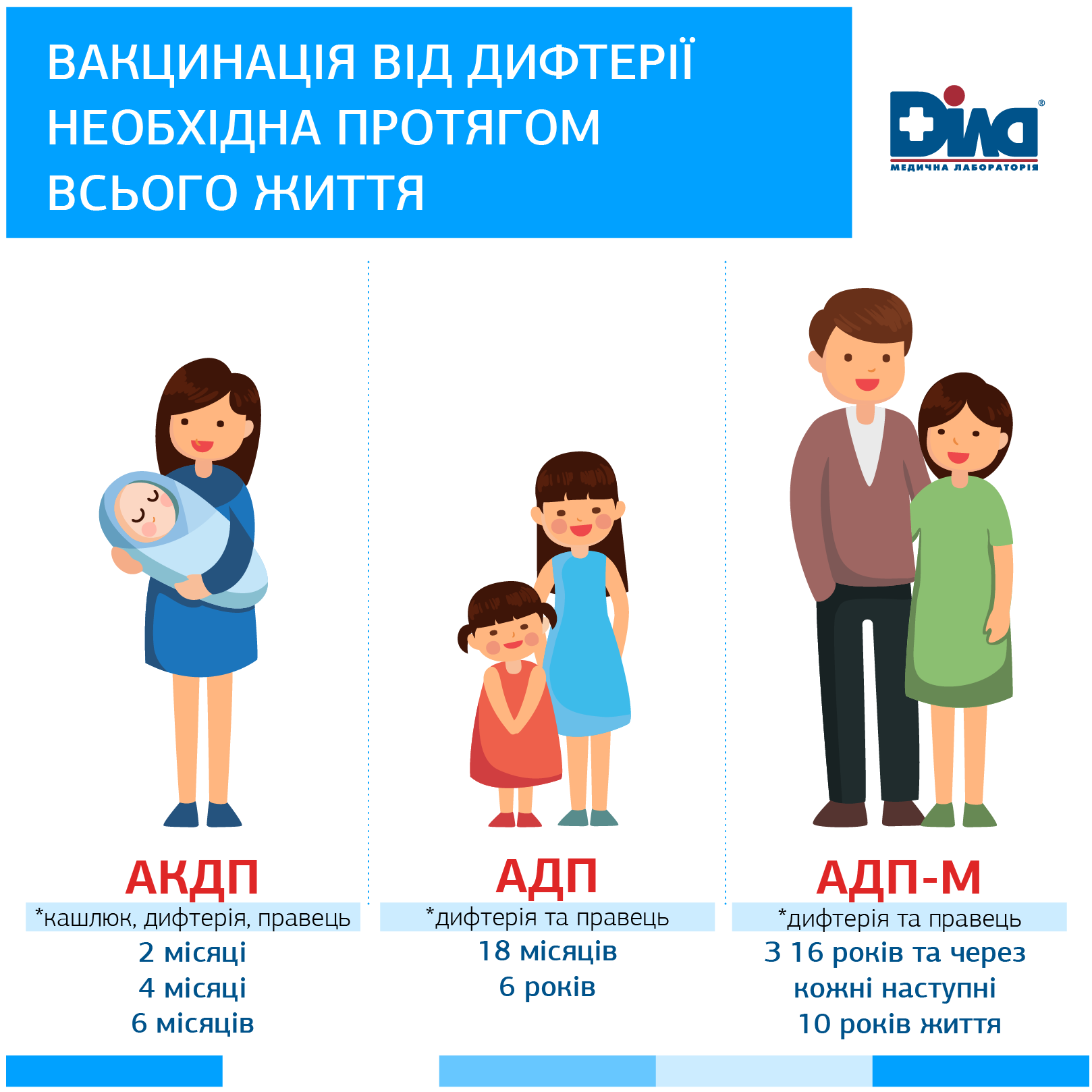 Согласно данным о «Календаре профилактических прививок» МОЗ Украины прививки против дифтерии проводятся в возрасте: