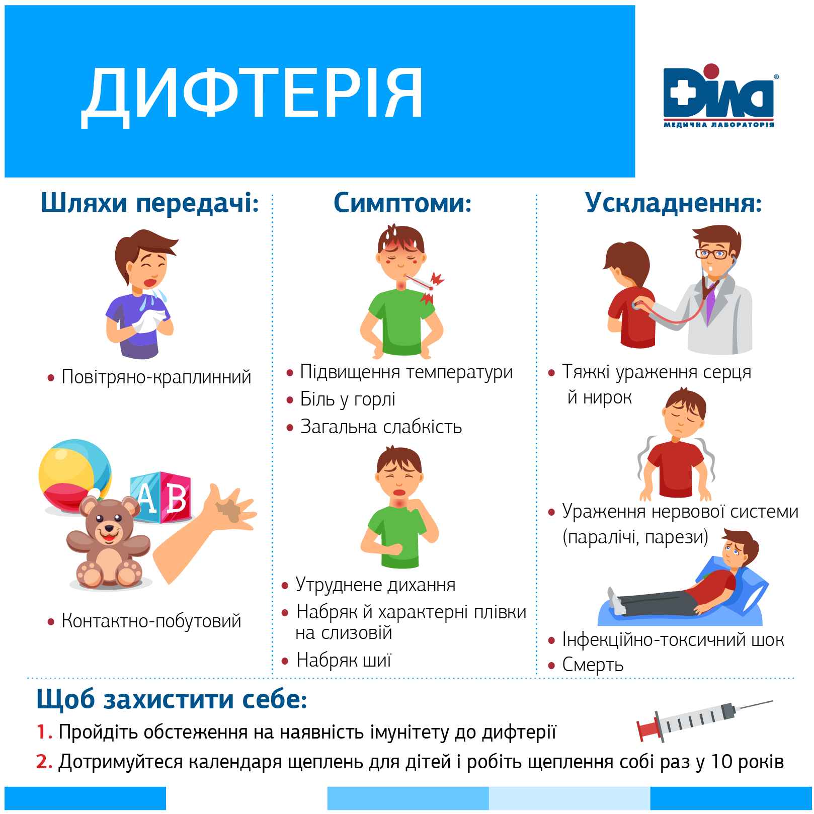 В связи со вспышкой дифтерии на западе Украины медицинская лаборатория ДІЛА рекомендует быть внимательными к своему здоровью и обратить внимание на уровень защиты против инфекции. Избежать заражения поможет вакцинация, но всем ли она нужна в обязательном порядке?