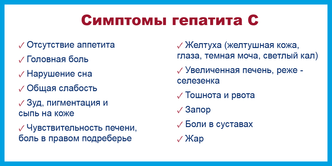 Инкубационный период гепатита C варьируется от 14 дней до полугода. Самое страшное в этой инфекции – это то, что после заражения около 80% носителей вируса не чувствуют никаких проявлений инфекции, а при острой форме симптомы схожи с обычной простудой либо гриппом. Не зря гепатит C часто называют «Ласковый убийца». Признаки гепатита C представлены ниже: