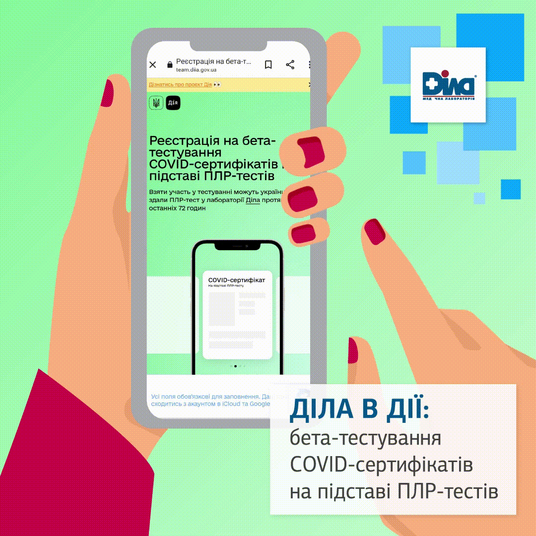 У нас для вас отличная новость, которая сделает вашу жизнь более удобной и понятной. ДІЛА совместно с Минцифра, МОЗ и НСЗУ одной из первых среди лабораторий Украины присоединилась к бета-тестированию COVID-сертификатов на основании ПЦР-тестов в приложении ДІЯ. Мы будем передавать данные об отрицательных результатах ПЦР тестов, на основании чего будет генерироваться сертификат.