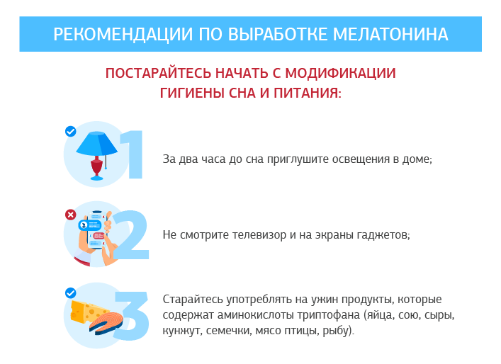 Если уровень мелатонина на нижней границе нормы, не спешите принимать препараты мелатонина. Лишний гормон может нанести только вред вашему организму. Постарайтесь начать с модификации гигиены сна и питания: